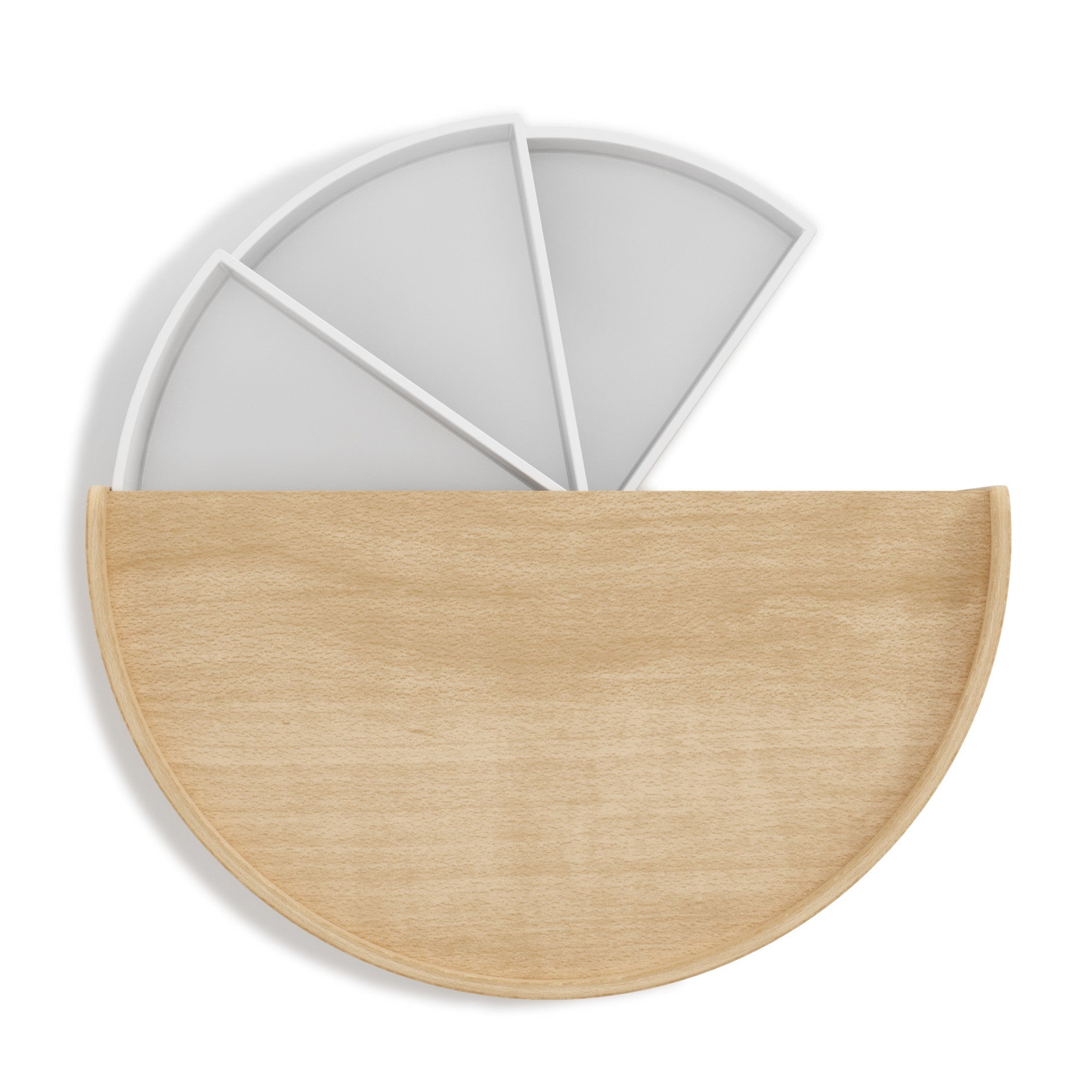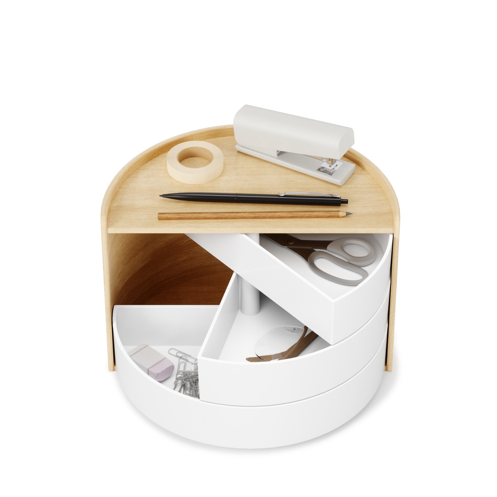 Moona features round, circular shapes for a one-of-a-kind jewelry organizer. Both decorative and functional, Moona has a large display top that doubles as a tray for smaller accessories, perfume, small plants or other items. Its three rotating drawers can provide hidden storage or be pushed out for easy access. With its unique semi-circle shape and beautiful wood accents, Moona can be displayed on your vanity, counter, dresser, desk and more. Made with recycled plastics and sourced from renewable wood sources. Wood is a unique natural material with variations in tone, texture, and grain. The product may vary from our imagery. ⓘ For Best Care: wipe with a clean damp cloth